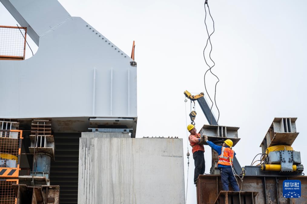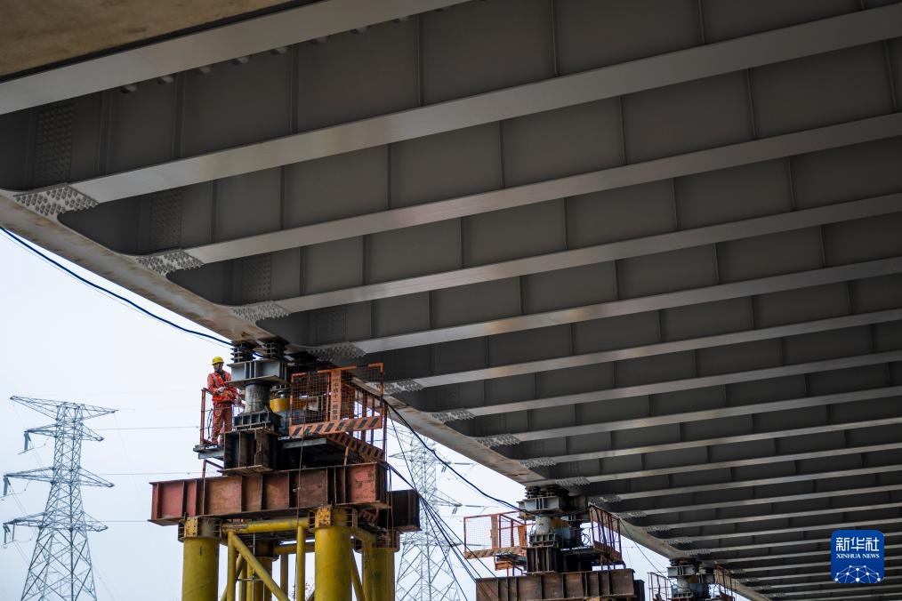 11月19日,中鐵十一局工人在鋼桁梁頂推施工完成后拆卸臨時支架。