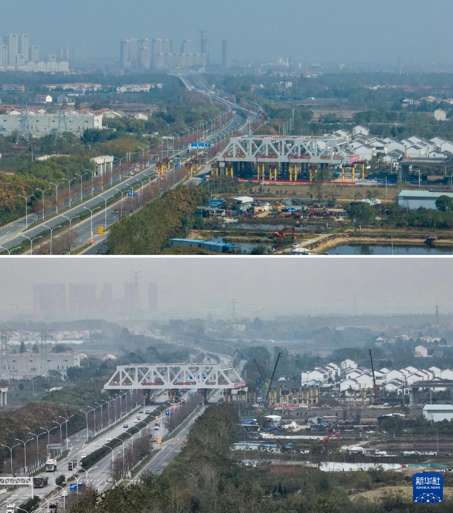 拼版照片:上圖為11月11日拍攝的鋼桁梁頂推施工現(xiàn)場(新華社發(fā),無人機照片);下圖為11月19日拍攝的鋼桁梁頂推施工完成現(xiàn)場(新華社記者伍志尊攝,無人機照片)。