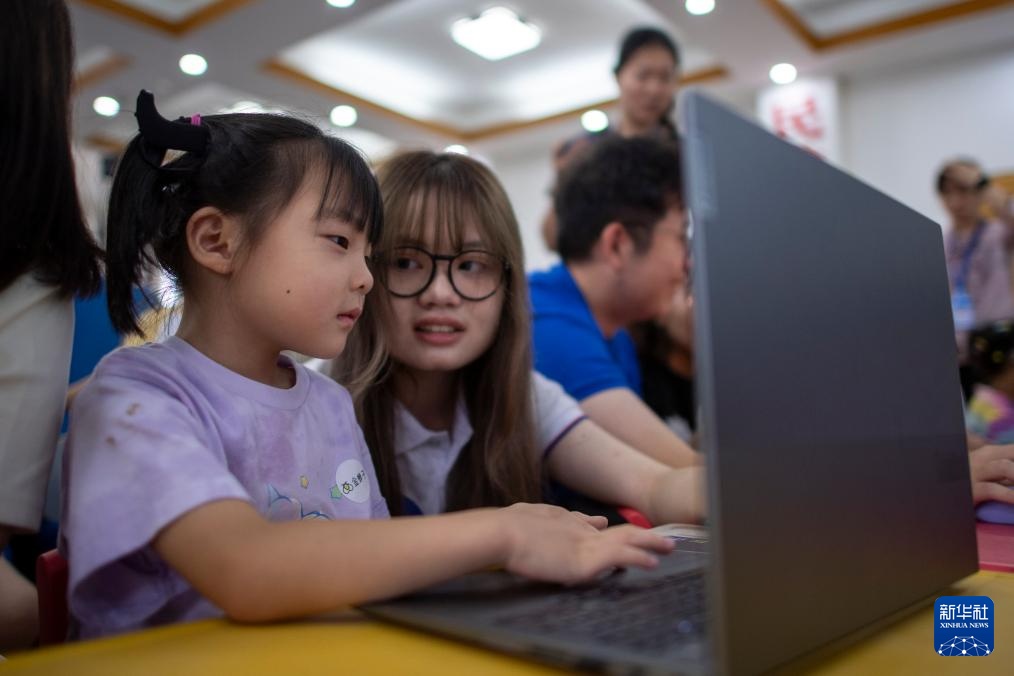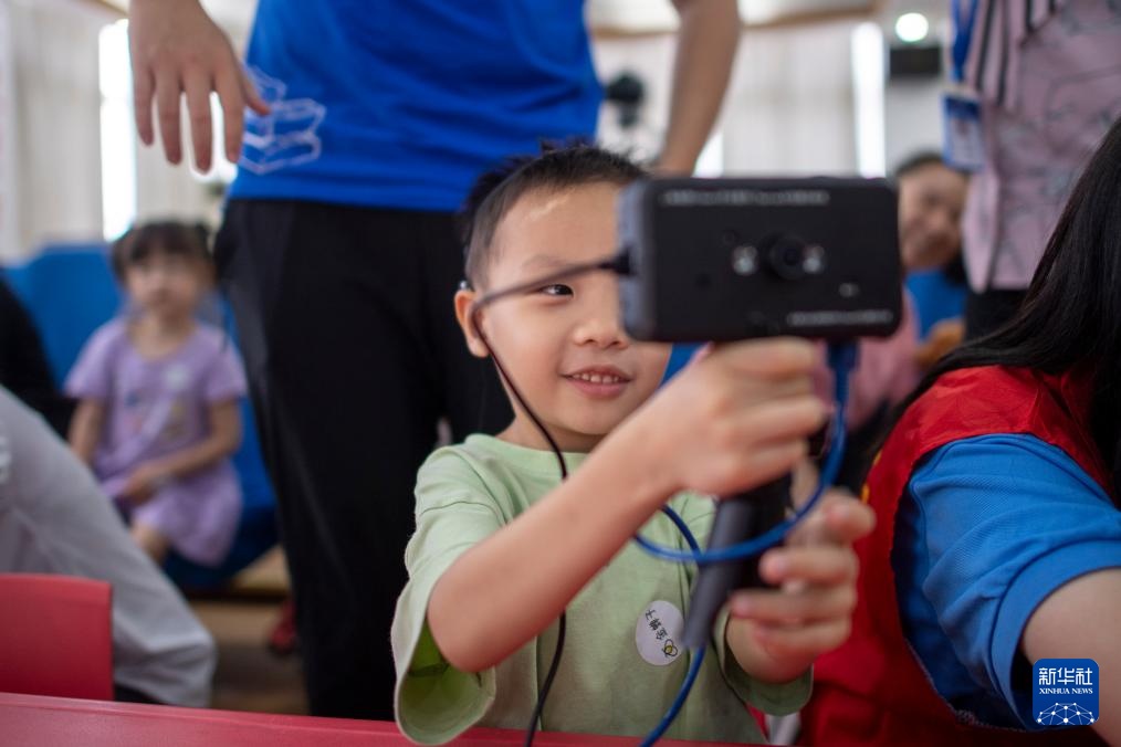 9月19日,在湖北省聾兒康復中心,一名聽障兒童在體驗金蟬子公益團隊研發的唇語輔助訓練系統。金蟬子公益團隊會定期前往湖北省聾兒康復中心,對聽障小朋友們開展發聲教學活動。
