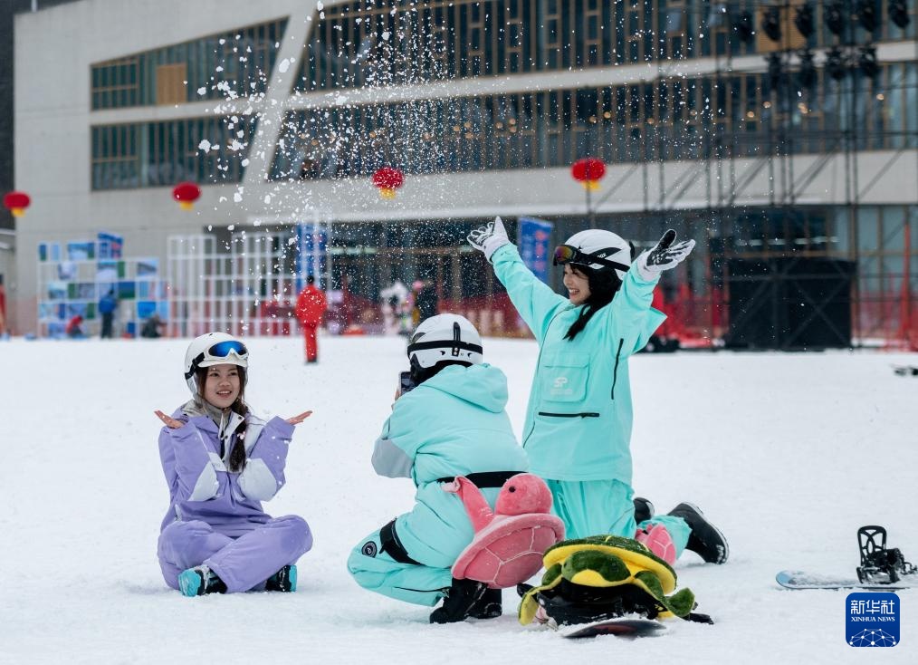 12月26日,游客在綠蔥坡滑雪場(chǎng)拍照。