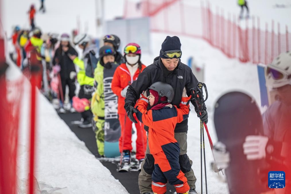12月26日,游客在綠蔥坡滑雪場(chǎng)乘坐傳送魔毯。