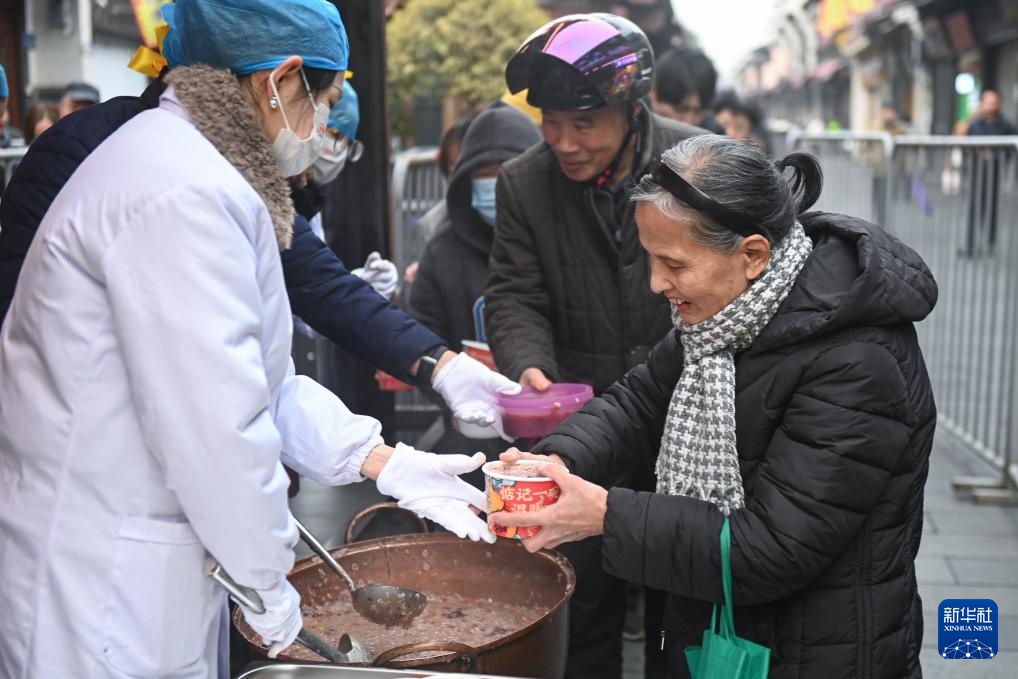 1月7日,市民在杭州河坊街方回春堂領取臘八粥。杭州方回春堂公益派粥活動已經堅持了20余年。