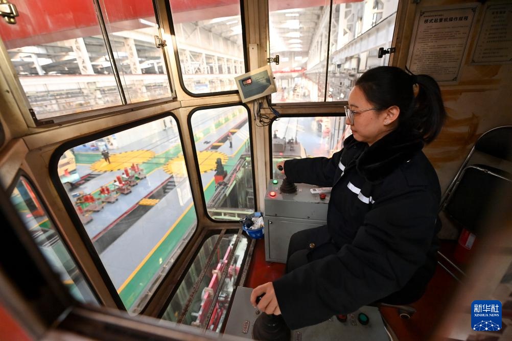 在中國鐵路太原局集團有限公司太原機務段太北檢修車間,天車司機王孟媛在天車上作業(1月10日攝)。