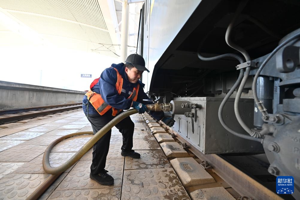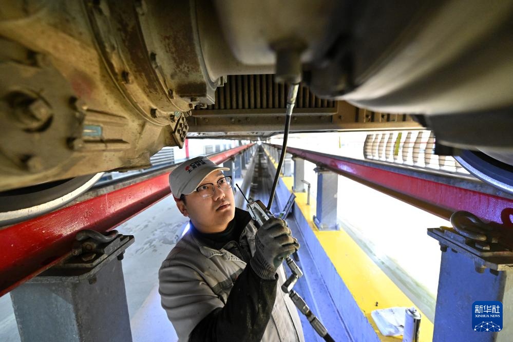 動車組機械師黨子淳在太原動車組運用所對列車進行檢查維護(1月9日攝)。