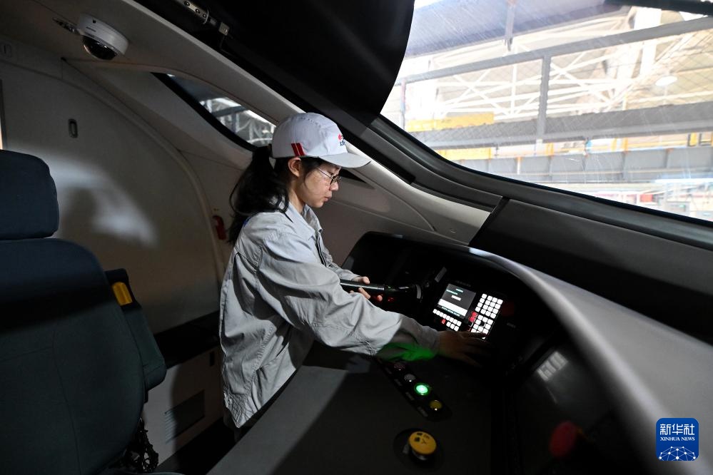 在中國鐵路太原局集團有限公司太原車輛段太原動車組運用所,高鐵司機馬曉冬(左)和楊天雨檢查列車車內設施(1月10日攝)。