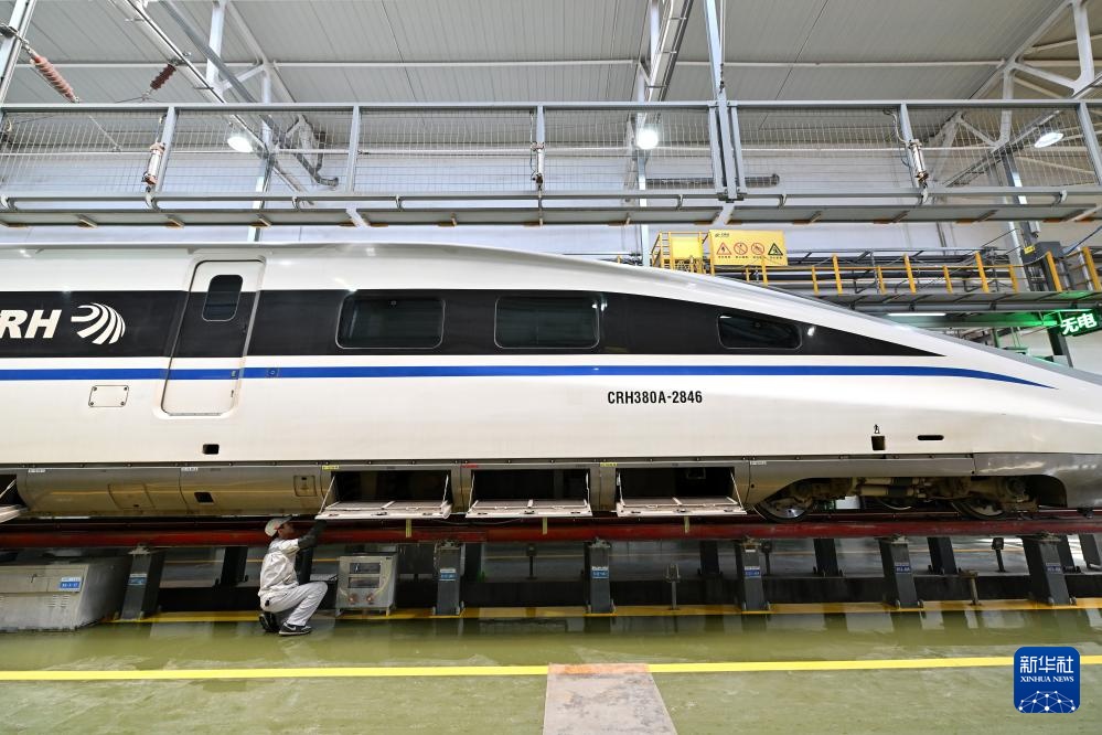 在太原動車組運用所,動車組機械師李珍河在列車底部進行檢查維護(1月9日攝)。