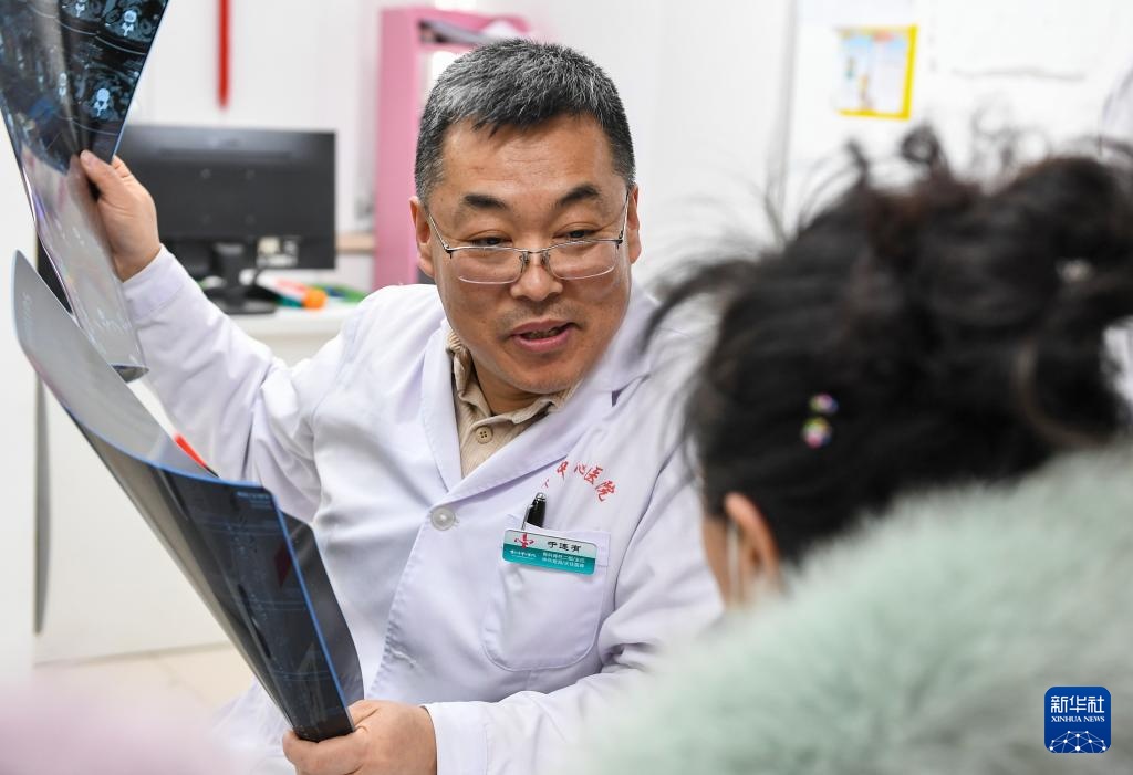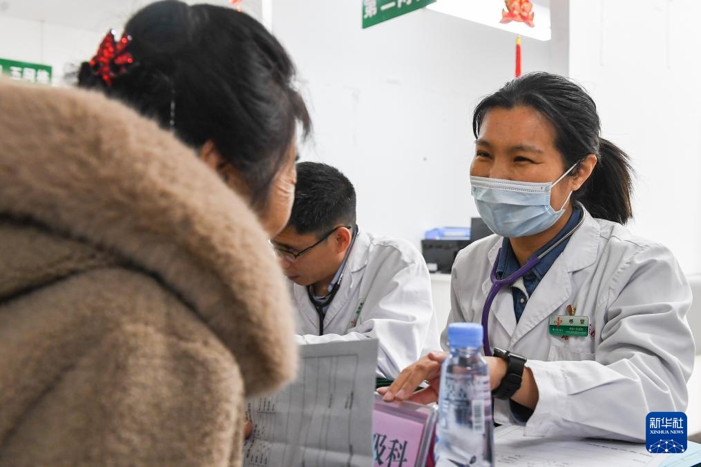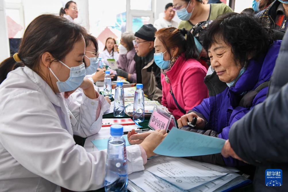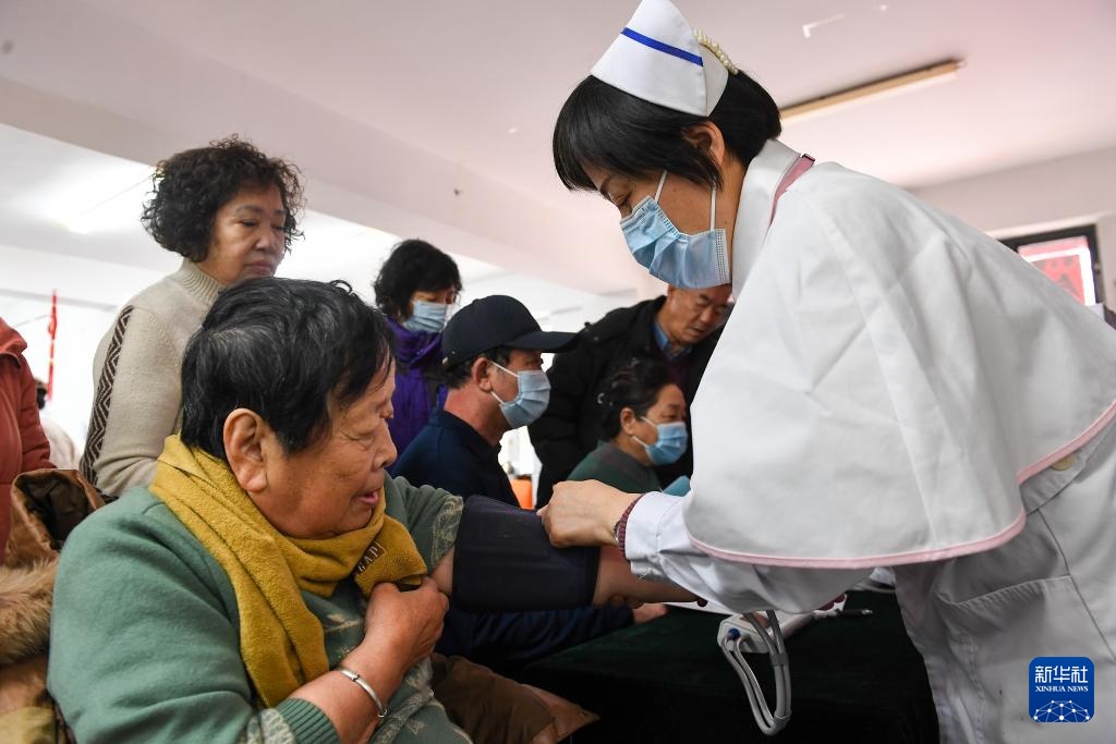 3月4日,在吉林省吉林市田園社區,吉林市醫療志愿者協會志愿者為居民檢查身體。