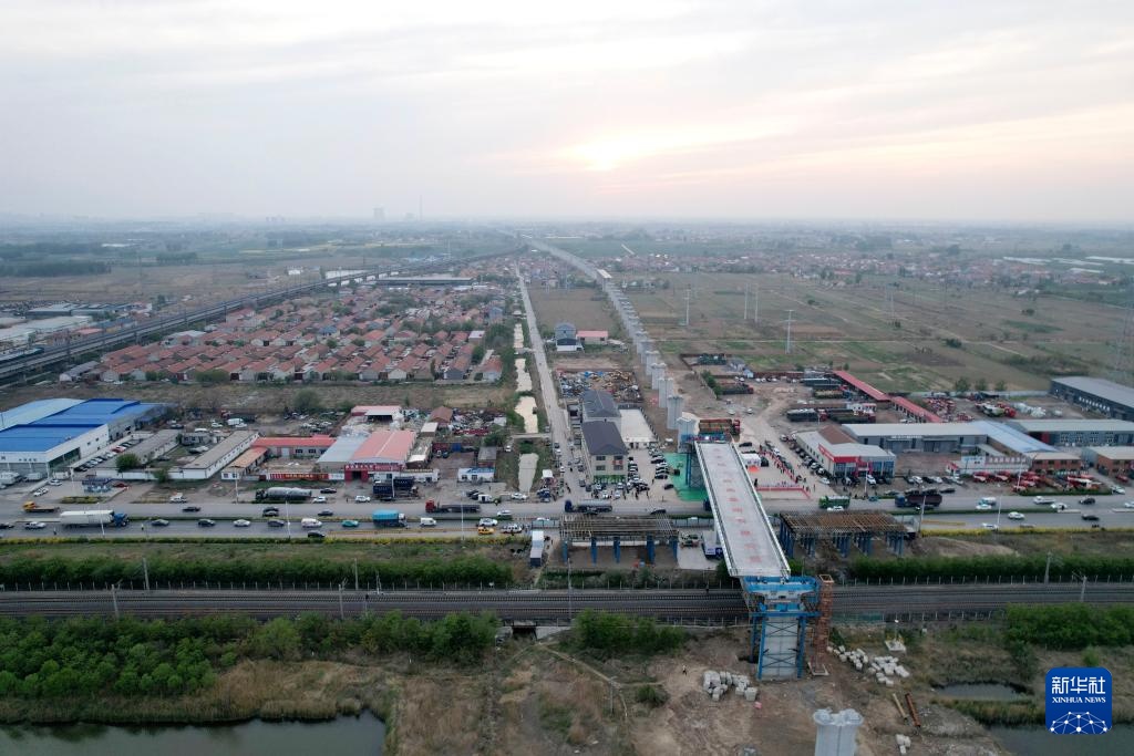 4月22日拍攝的石衡滄港城際鐵路跨京滬鐵路轉(zhuǎn)體橋(無人機照片)。