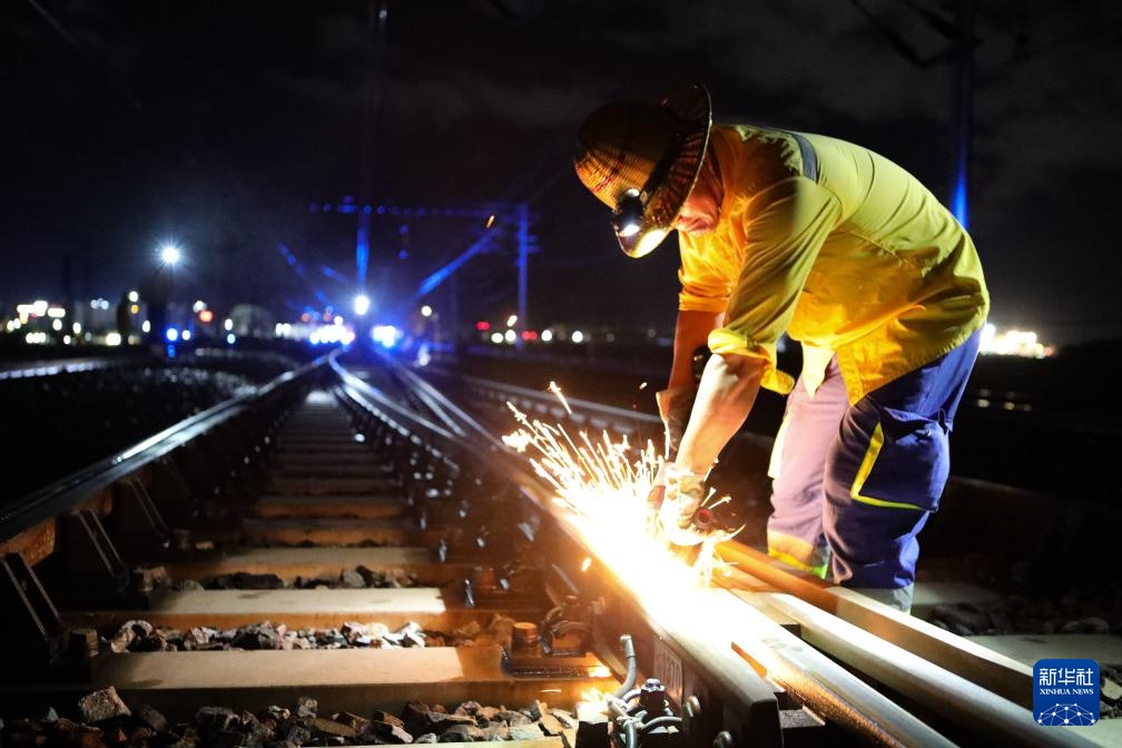 6月19日,中國(guó)鐵路昆明局集團(tuán)有限公司普洱基礎(chǔ)設(shè)施段作業(yè)人員在中老鐵路西雙版納站進(jìn)行鋼軌肥邊打磨作業(yè)。