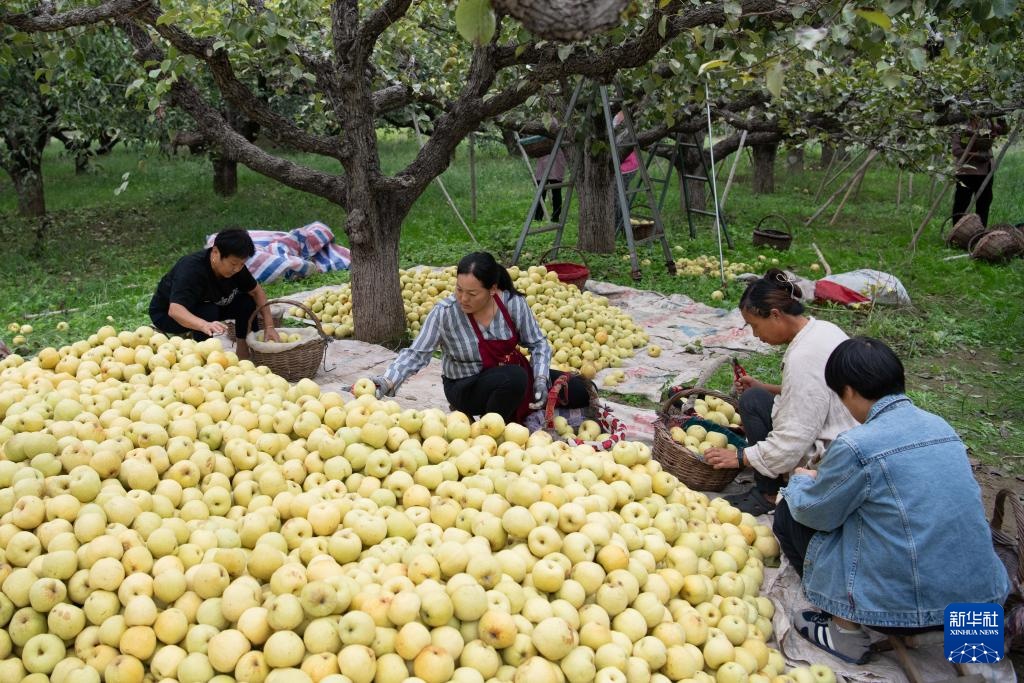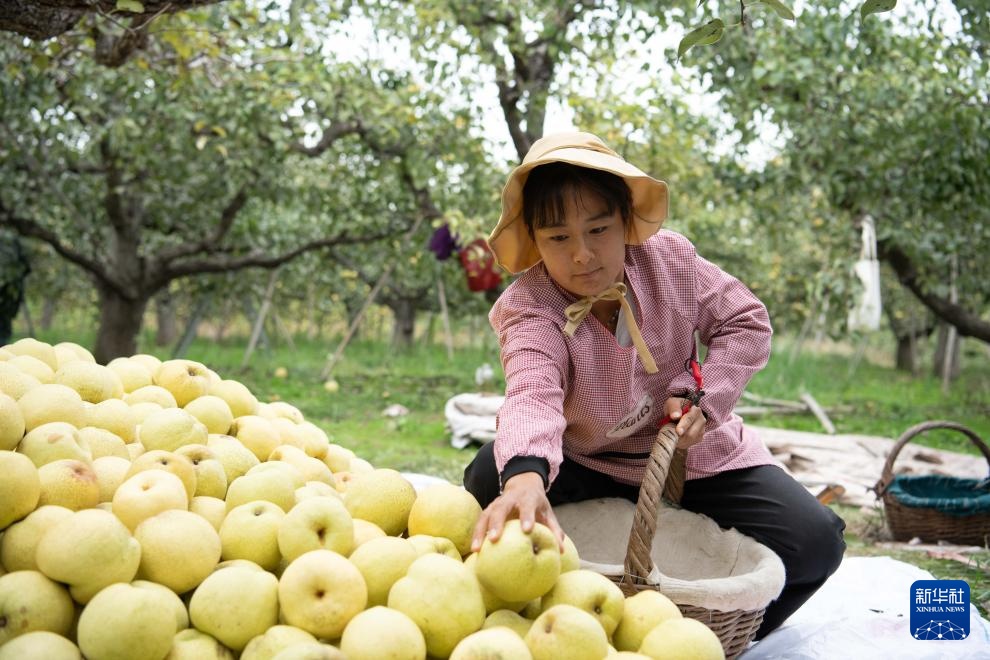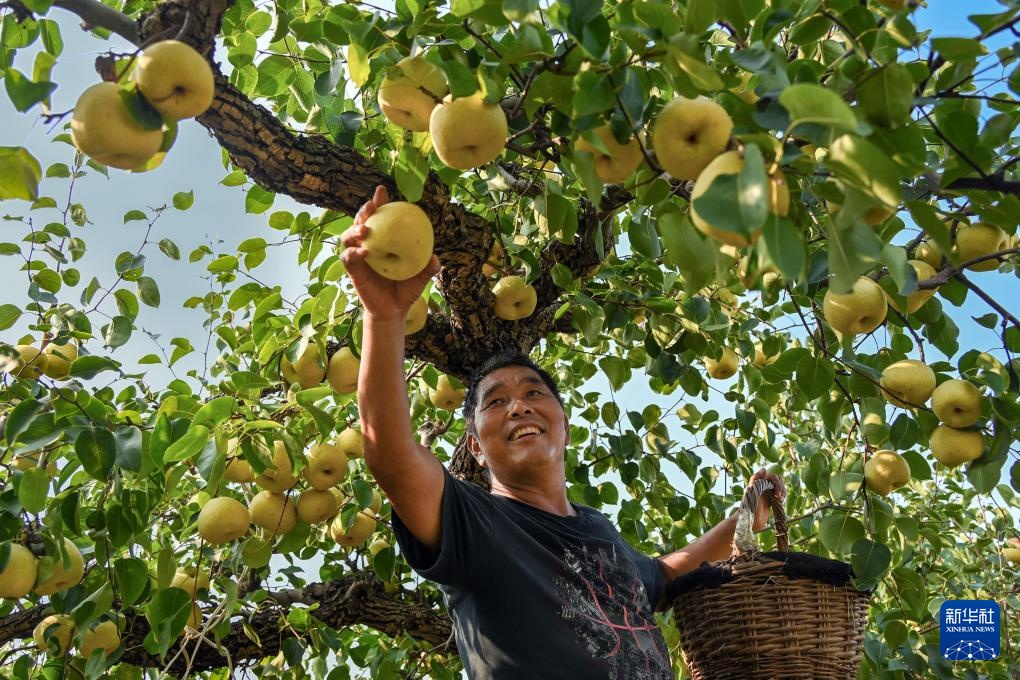 9月15日,在安徽省宿州市碭山縣一處梨園內(nèi),梨農(nóng)在采摘酥梨。
