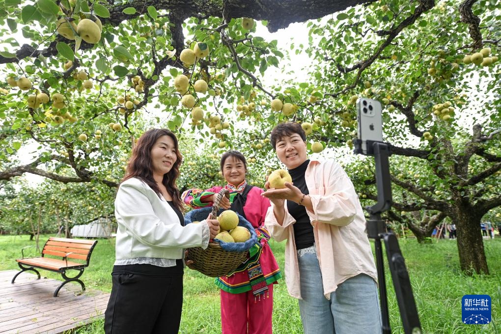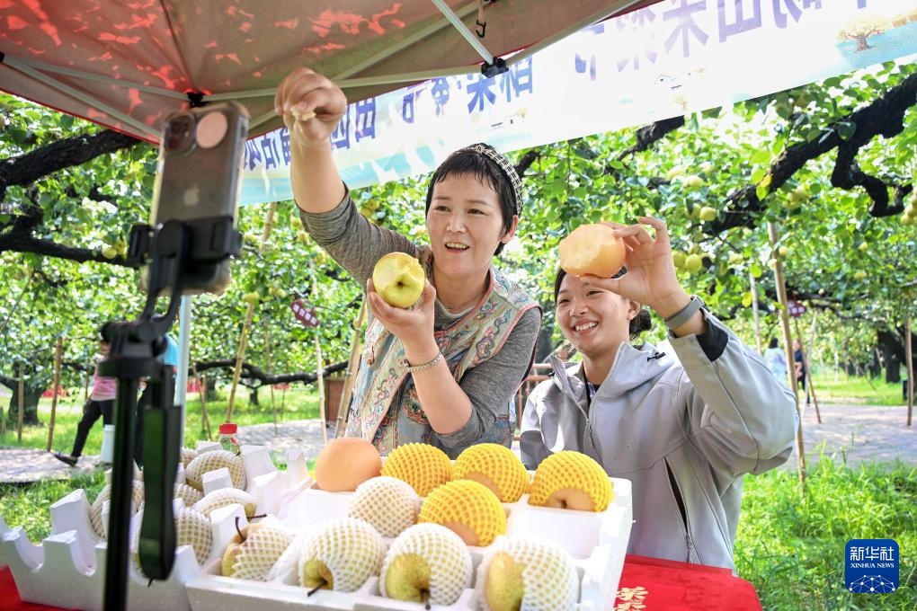 9月13日,在安徽省宿州市碭山縣一處梨園內(nèi),梨農(nóng)張雪芝(左)通過視頻直播的方式銷售酥梨。