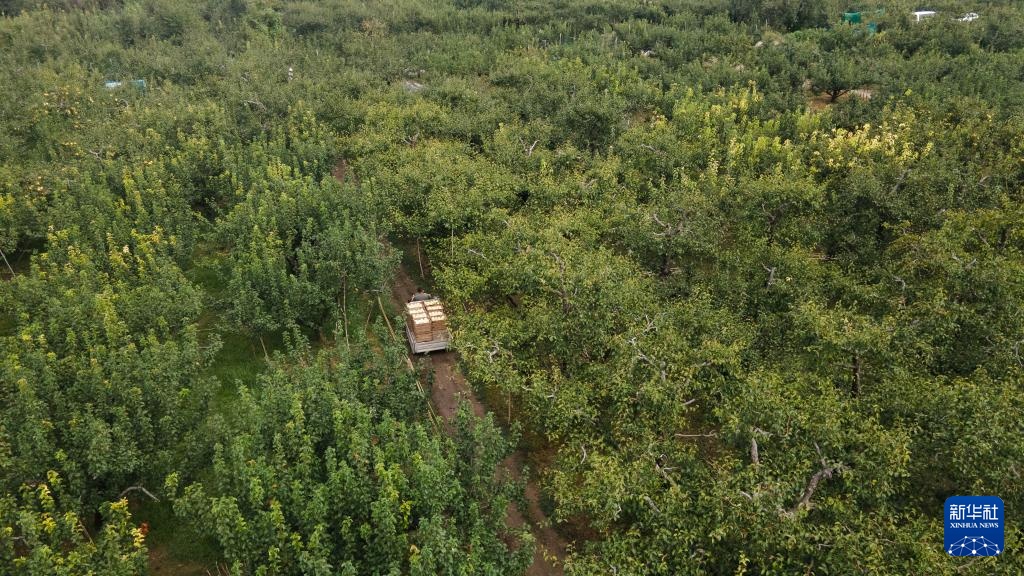 9月20日,在安徽省宿州市碭山縣一處梨園內(nèi),梨農(nóng)在轉(zhuǎn)運裝車的酥梨(無人機(jī)照片)。