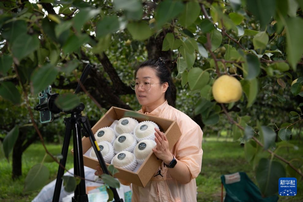 9月18日,在安徽省宿州市碭山縣一處梨園內(nèi),創(chuàng)業(yè)青年李貝通過視頻直播的方式銷售酥梨。