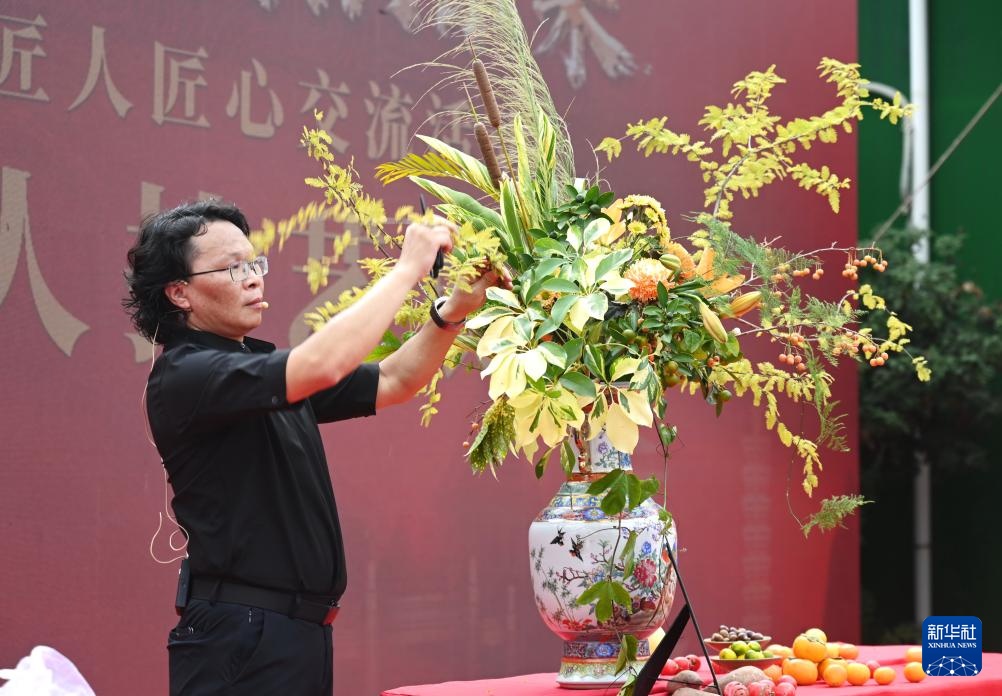 10月18日,匠人在技藝展示活動中進行插花藝術表演。