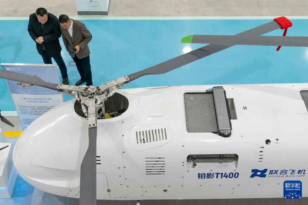 10月30日,在哈爾濱市平房區的哈爾濱聯合飛機科技有限公司生產廠區,參會人員參觀T1400無人直升機。