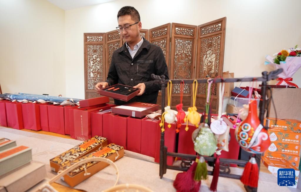 返鄉(xiāng)創(chuàng)業(yè)青年石磊在隆德縣城關(guān)鎮(zhèn)楊家店村向游客介紹文創(chuàng)產(chǎn)品(10月26日攝)。