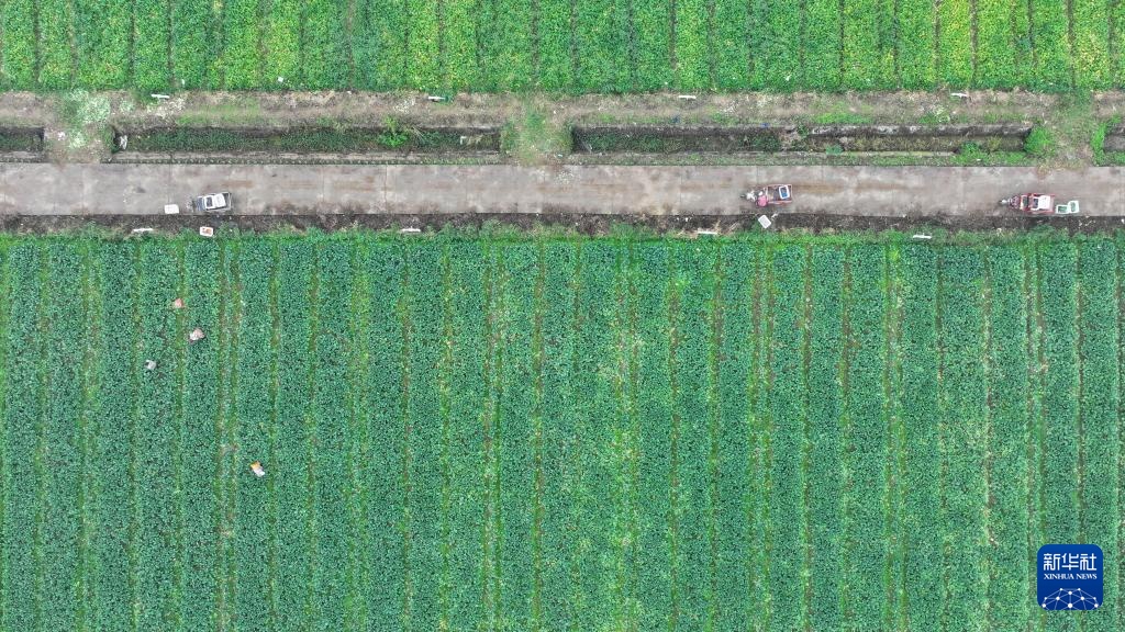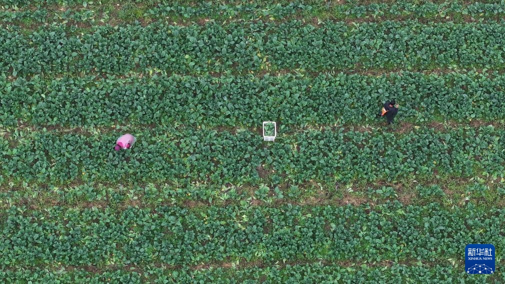 10月30日,菜農在沅江市草尾鎮樂園村蔬菜田里采收蔬菜(無人機照片)。