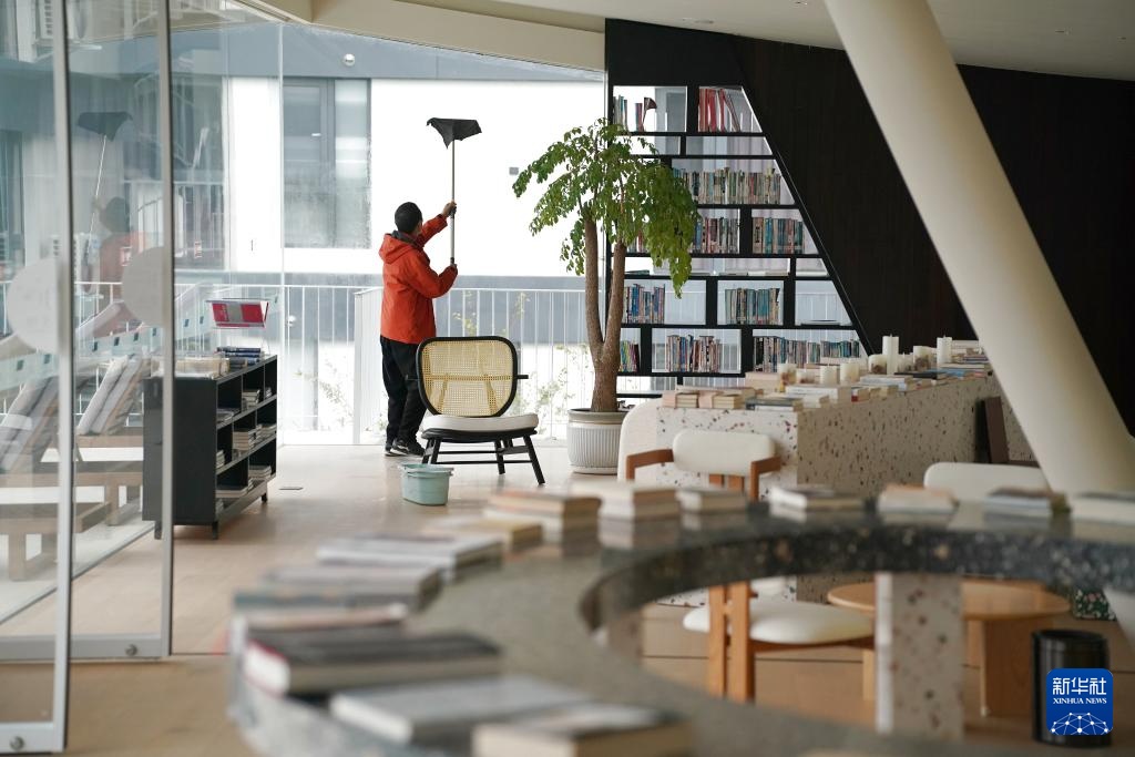 10月29日,在鎮(zhèn)坪縣牛頭店鎮(zhèn)國慶村,一家山居酒店工作人員在酒店書吧內打掃衛(wèi)生。