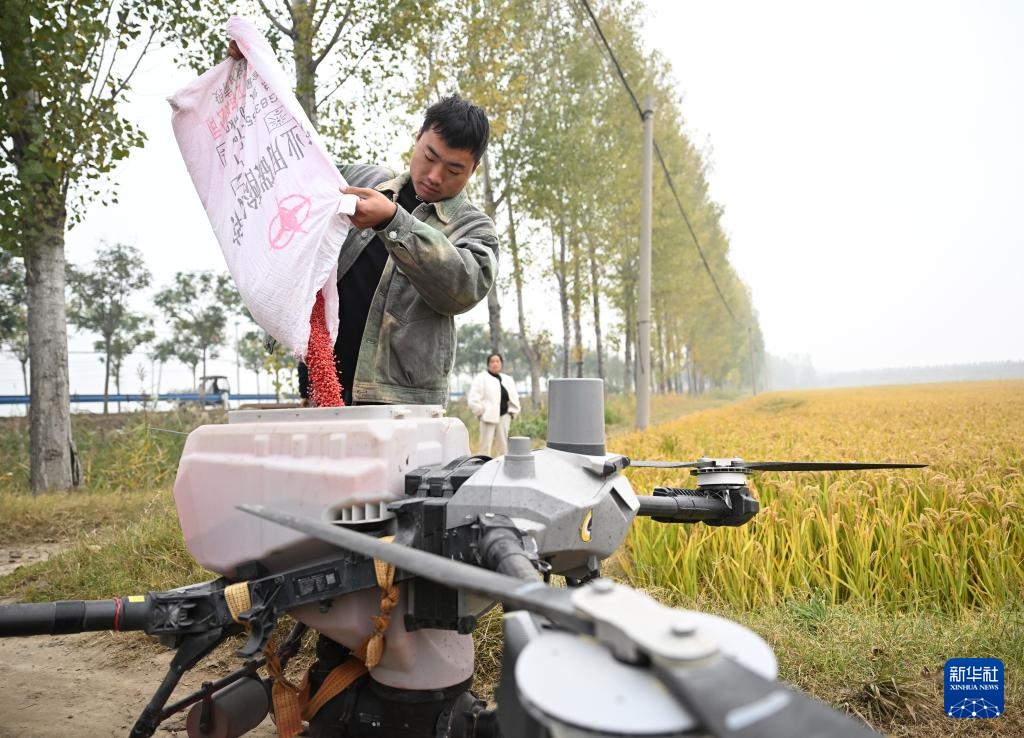 10月30日,在河南省原陽縣太平鎮太南村,農機手向無人機加載小麥種子。