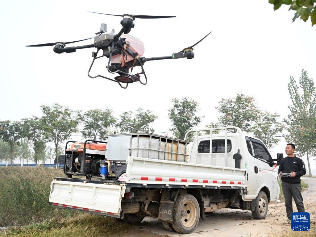 10月30日,在河南省清豐縣固城鎮張莊里村,農戶在操作無人巡田機起飛。