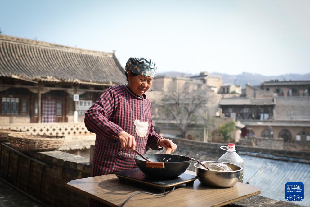 在山西省呂梁市臨縣磧口古鎮,村民在院子里做油糕(10月30日攝)。