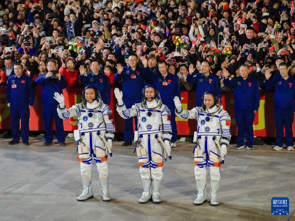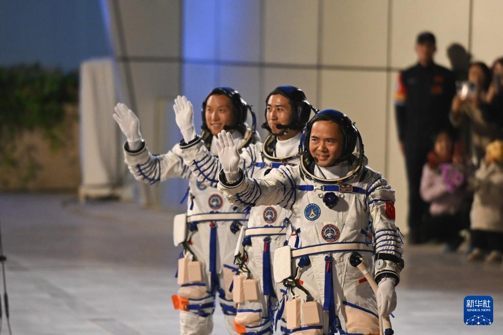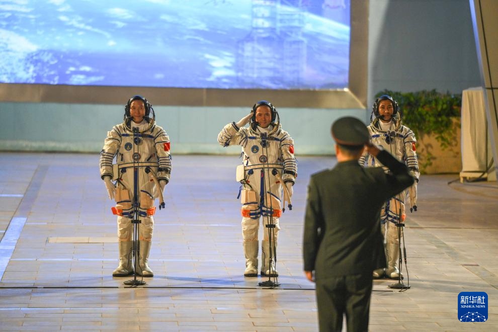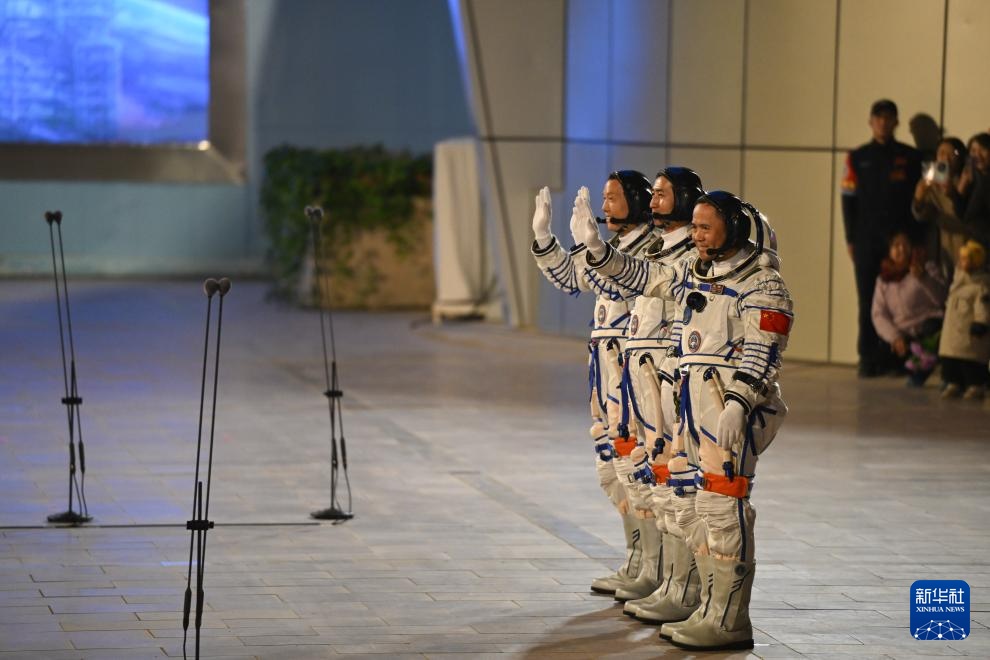 10月31日晚,神舟二十一號載人飛行任務航天員乘組出征儀式在酒泉衛星發射中心問天閣圓夢園廣場舉行。這是航天員張陸(右)、武飛(中)、張洪章在出征儀式上。