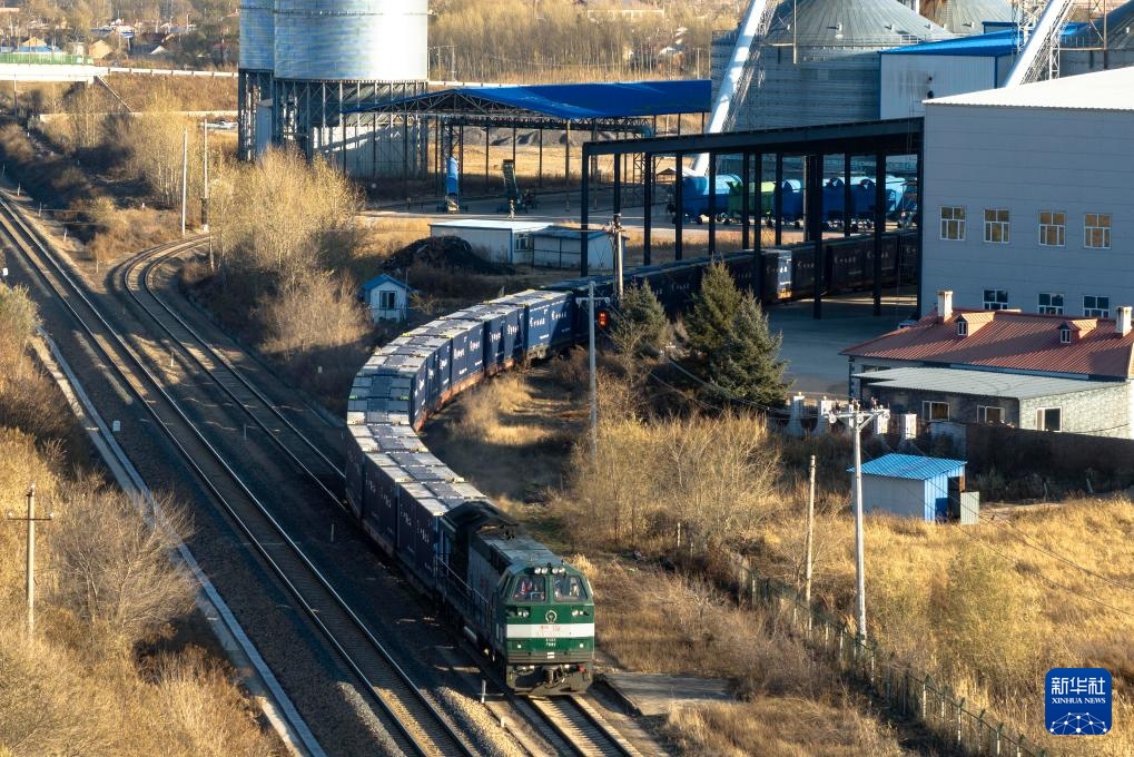 10月31日,在黑龍江省雙鴨山市的中糧天興物流園區專用線上,完成裝載的列車準備出發。
