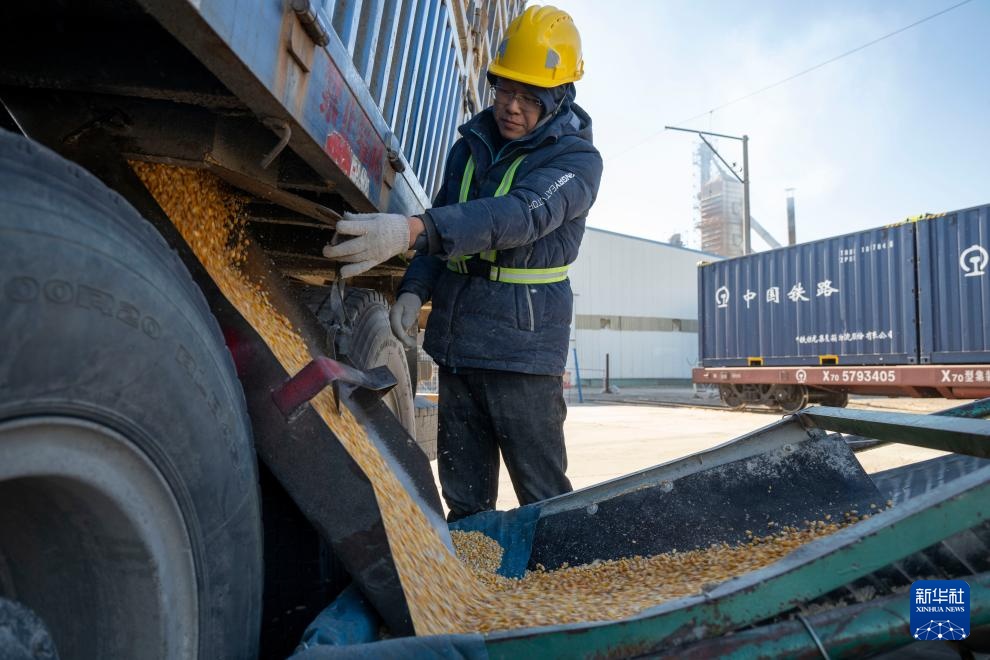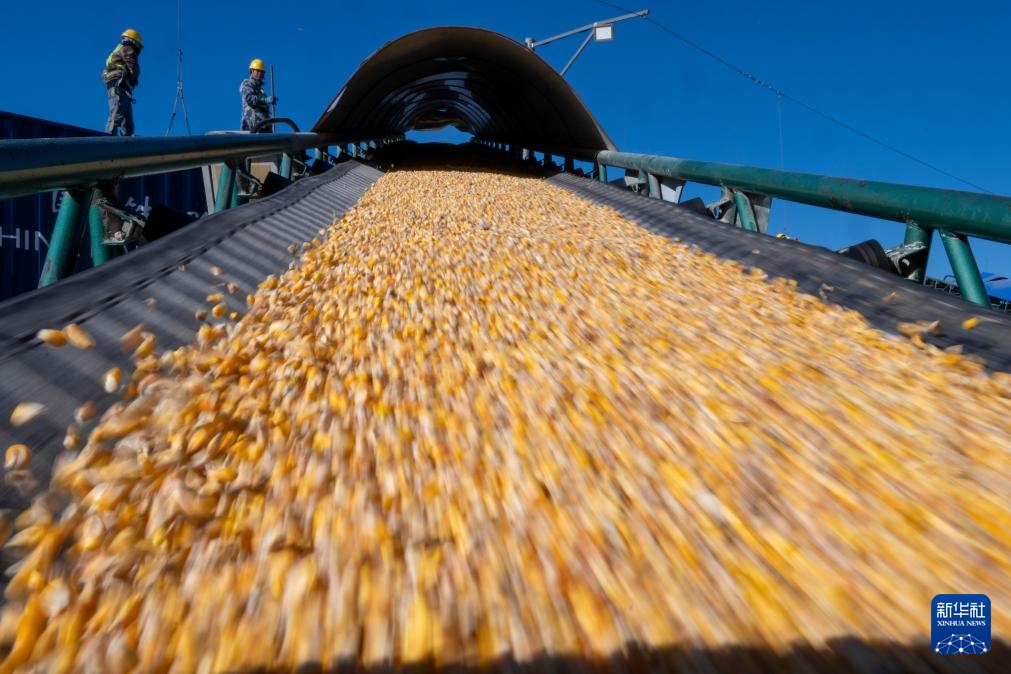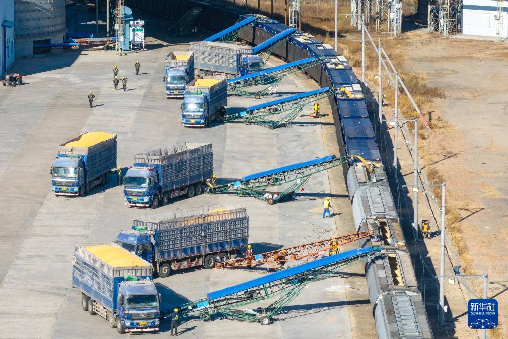 10月29日拍攝的位于黑龍江省鶴崗市的寶泉嶺站黑龍江甕福人和米業有限公司專用線上的玉米裝車現場(無人機照片)。