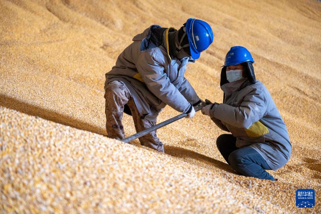 10月31日,在黑龍江省雙鴨山市的中糧天興物流園區倉儲庫,工人進行扦樣作業,了解儲存倉內大豆水分、雜質以及蟲害等情況。