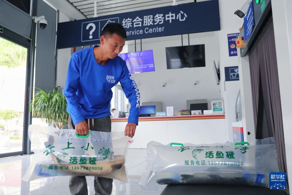 10月31日,工作人員將裝袋、加氧后的小灣東鎮(zhèn)生態(tài)江魚放上安檢設(shè)備,準(zhǔn)備通過高鐵動車運(yùn)往昆明。