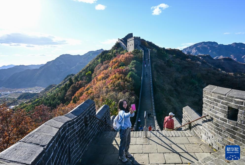 11月1日,游客在位于天津市薊州區的黃崖關長城上自拍。