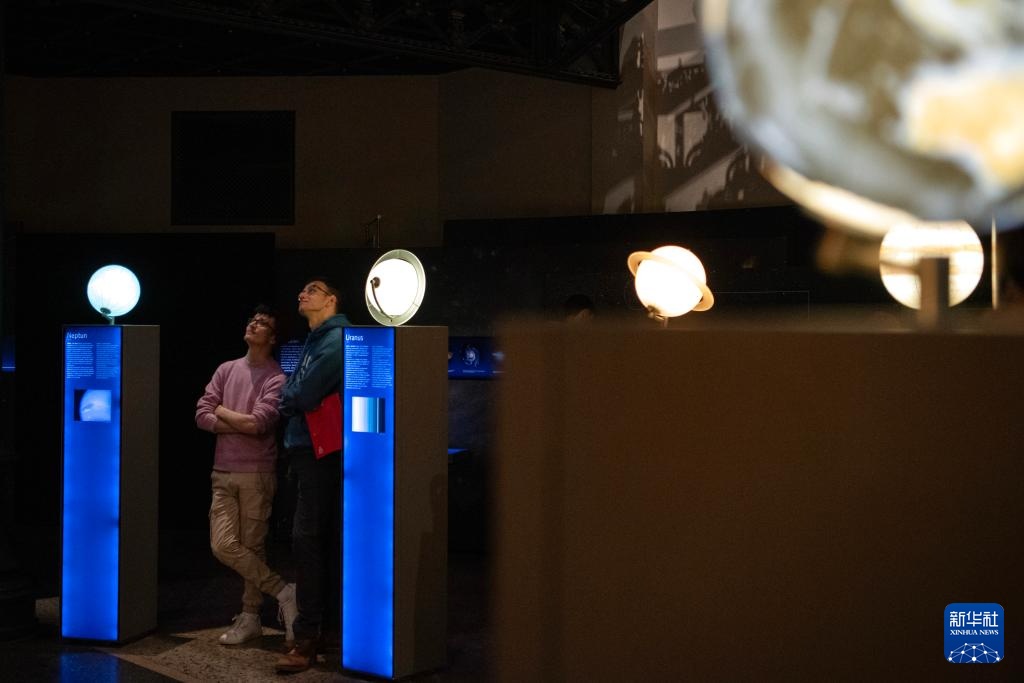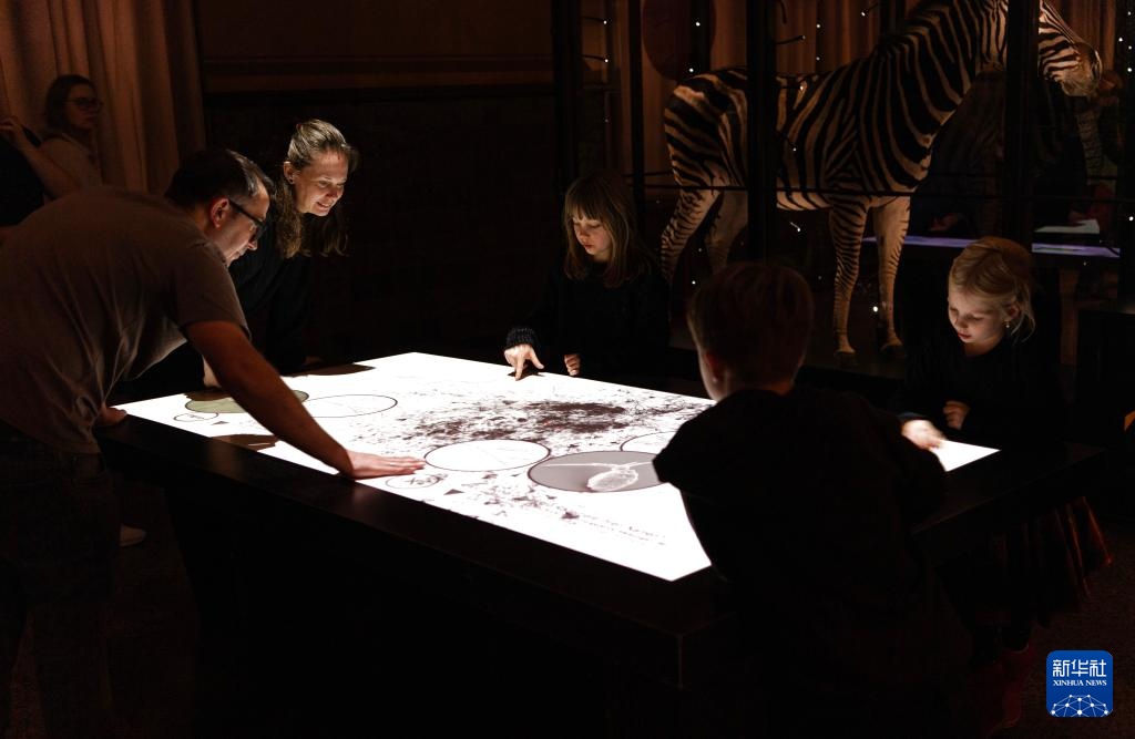11月1日,在德國柏林自然歷史博物館,人們體驗一款互動科普裝置。