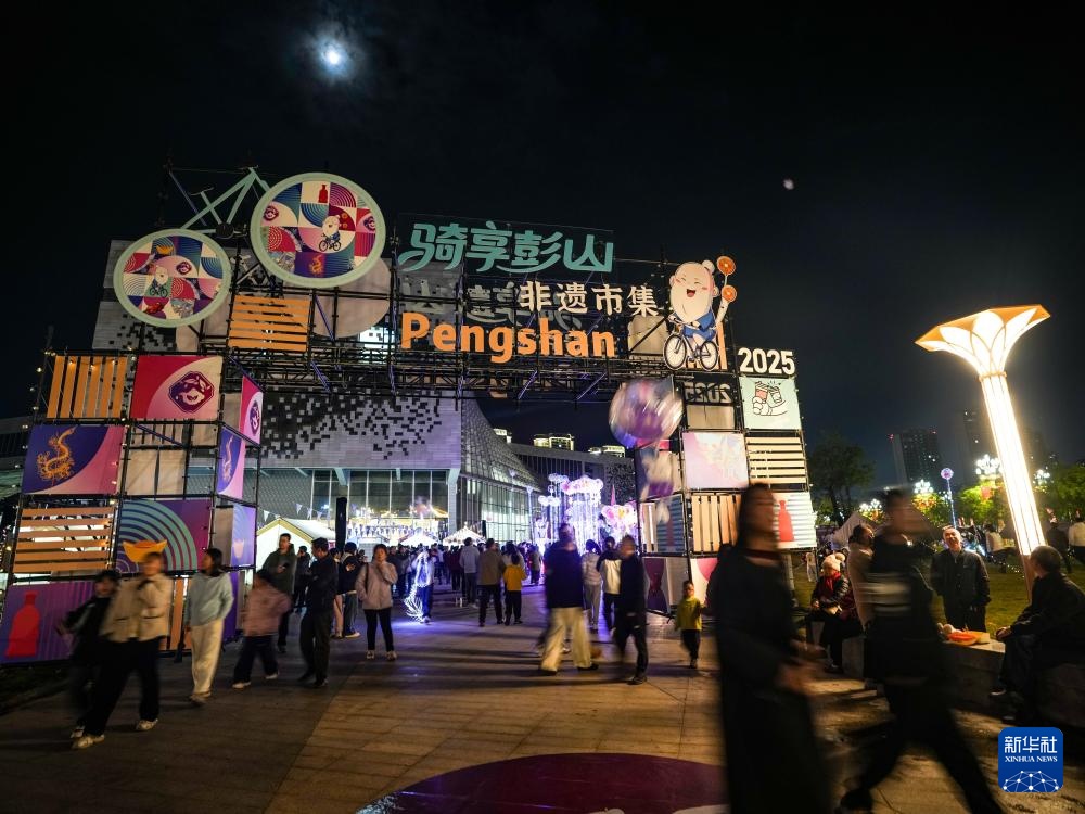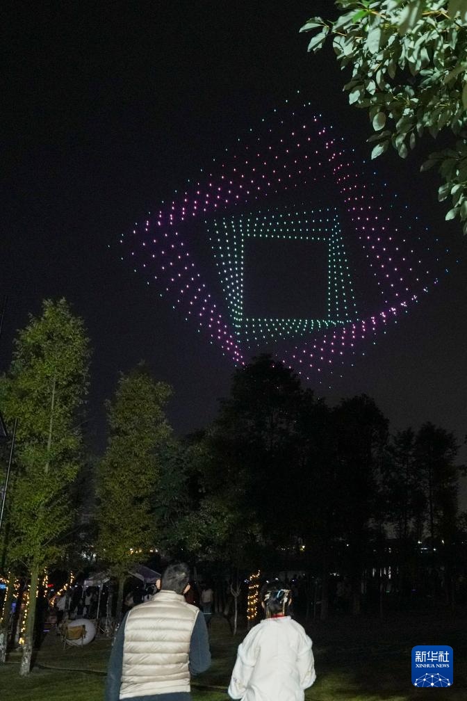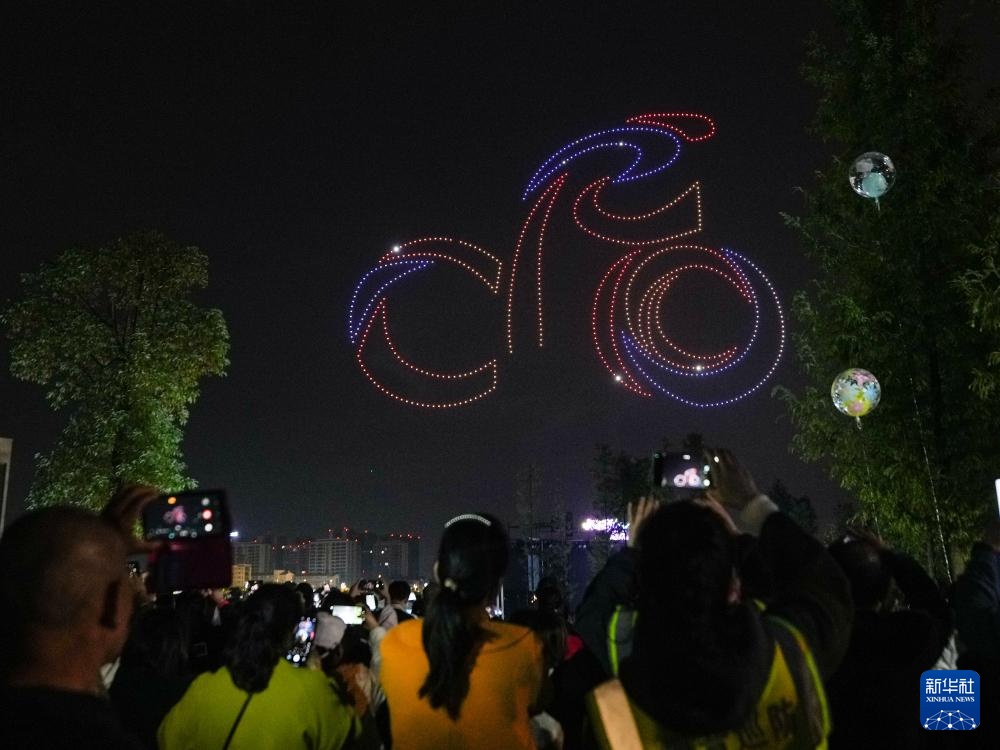 11月1日晚,2025中國公路自行車公開賽(眉山彭山站)開賽前夜,一場無人機表演點亮四川省眉山市彭山區的夜空,當地群眾在非遺市集和主題音樂會等多元文化活動中享受愜意的周末時光。