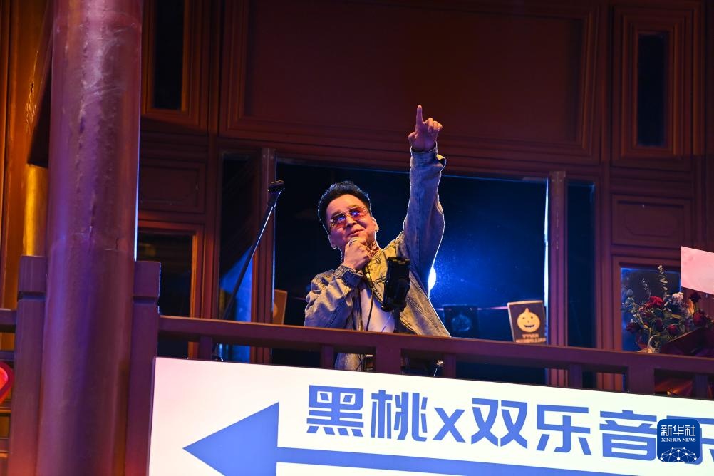 游客和表演人員在鐘樓街合影(11月1日攝)。