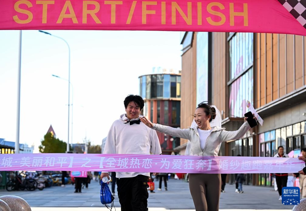 11月2日,參加活動的一對情侶沖過終點。