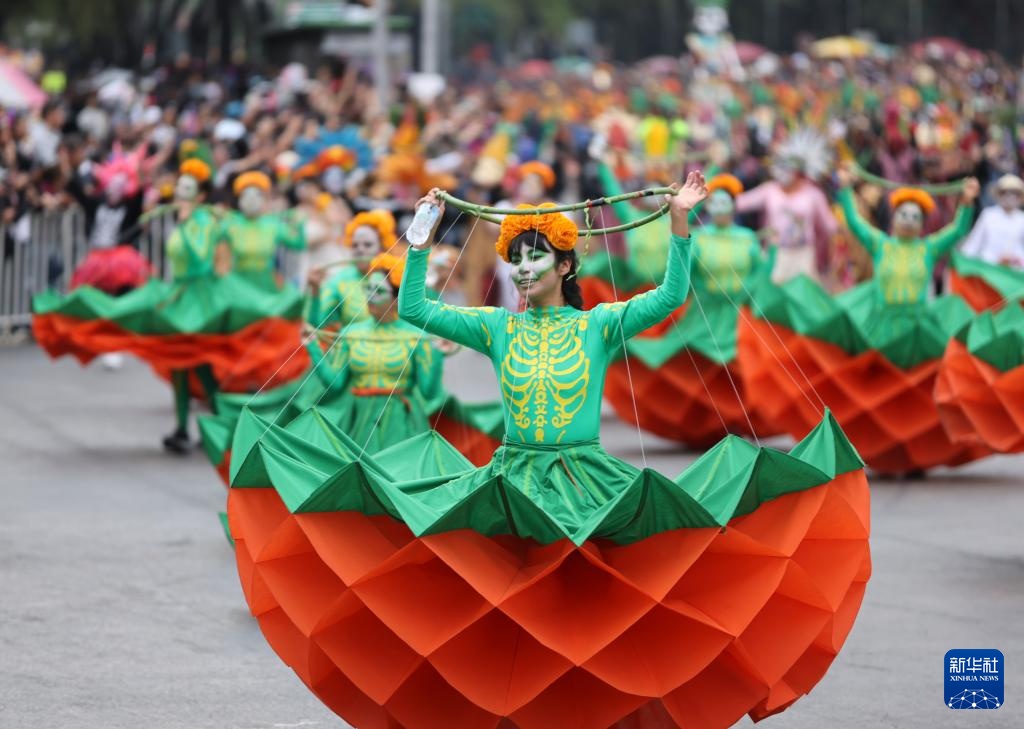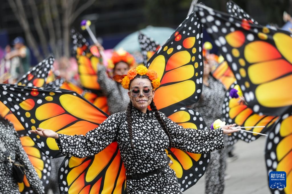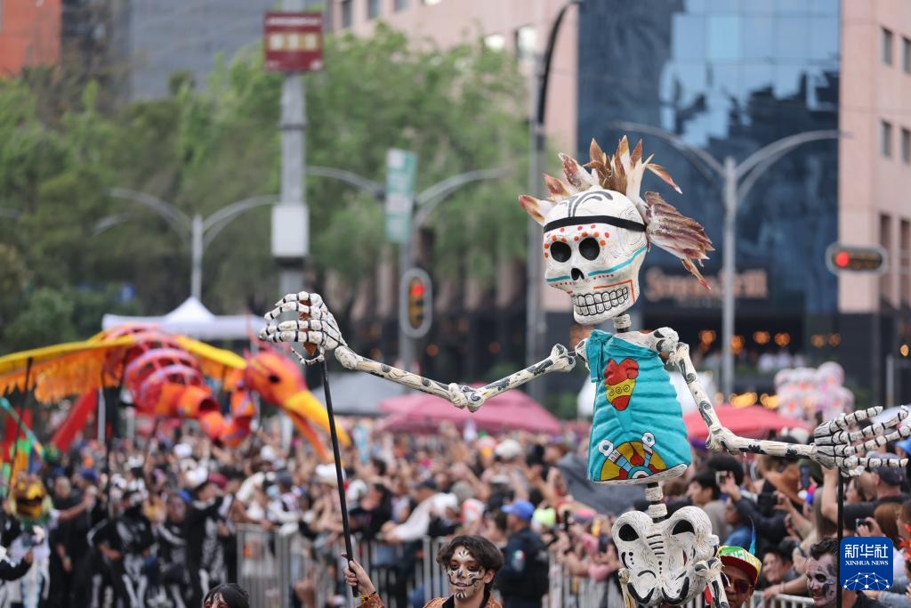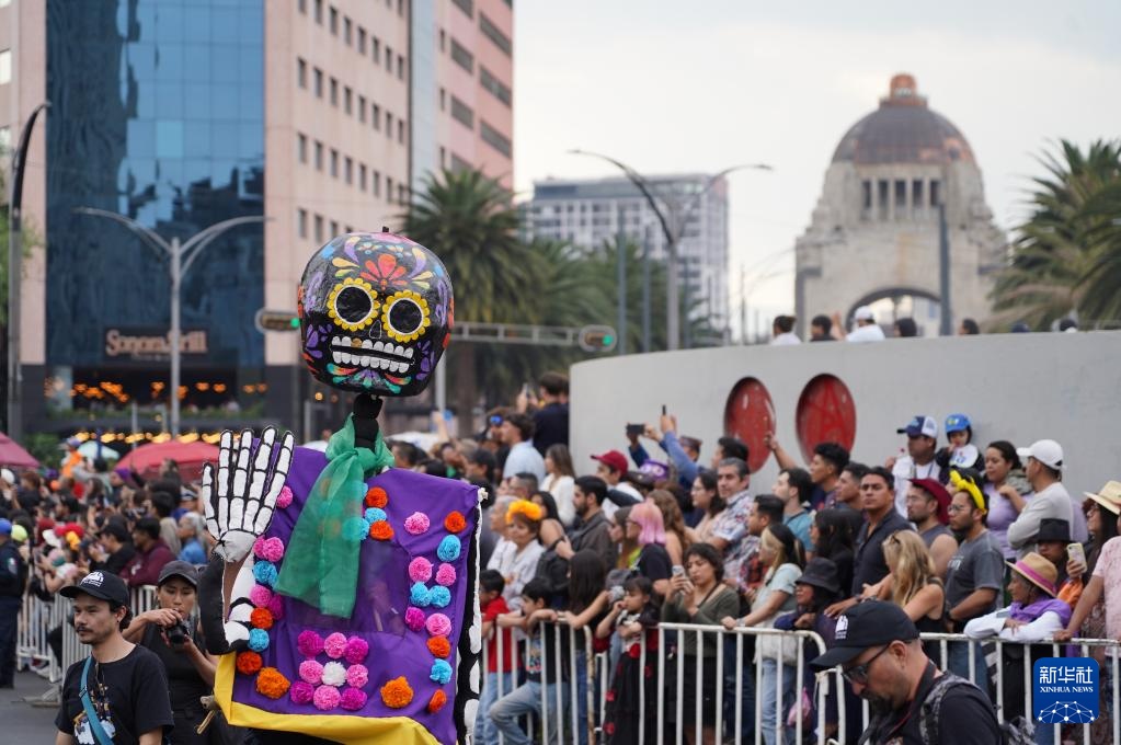 11月1日,在墨西哥首都墨西哥城,演員舉著亡靈節裝置參加游行。