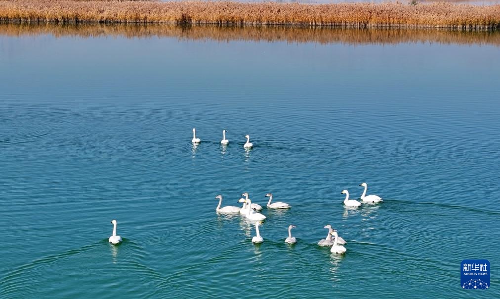 候鳥在寧夏銀川市西夏區犀牛湖游弋(無人機照片,11月2日攝)。