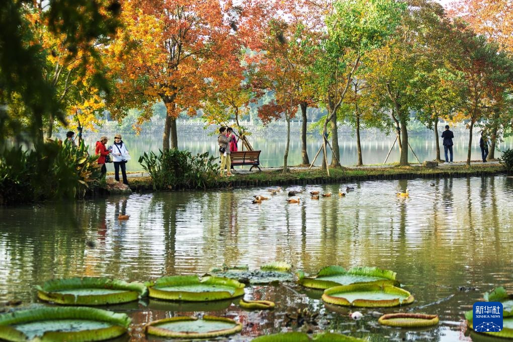 11月2日,人們在南京中山植物園月牙堤上觀賞秋景。
