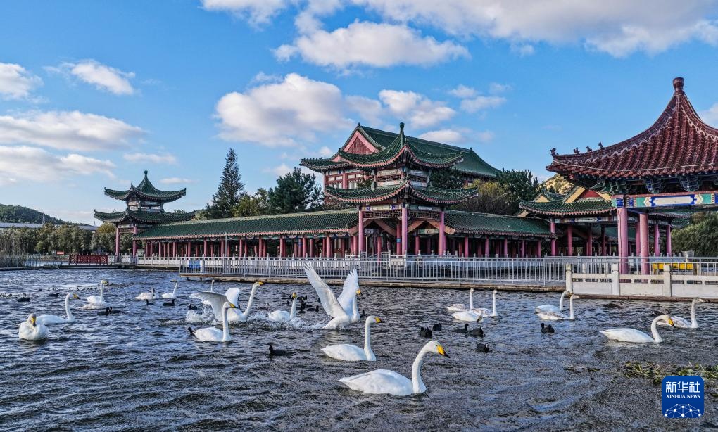 11月2日,在山東省榮成市成山鎮西霞口隆霞湖公園,大天鵝在棲息、覓食(無人機照片)。