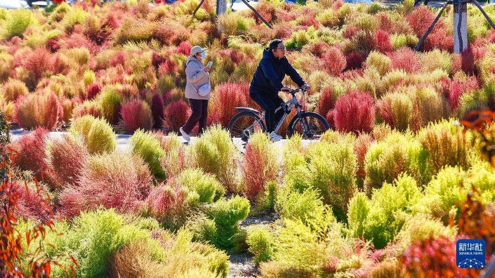 11月2日,游人在天津市濱海新區的白鷺洲公園賞秋游玩。