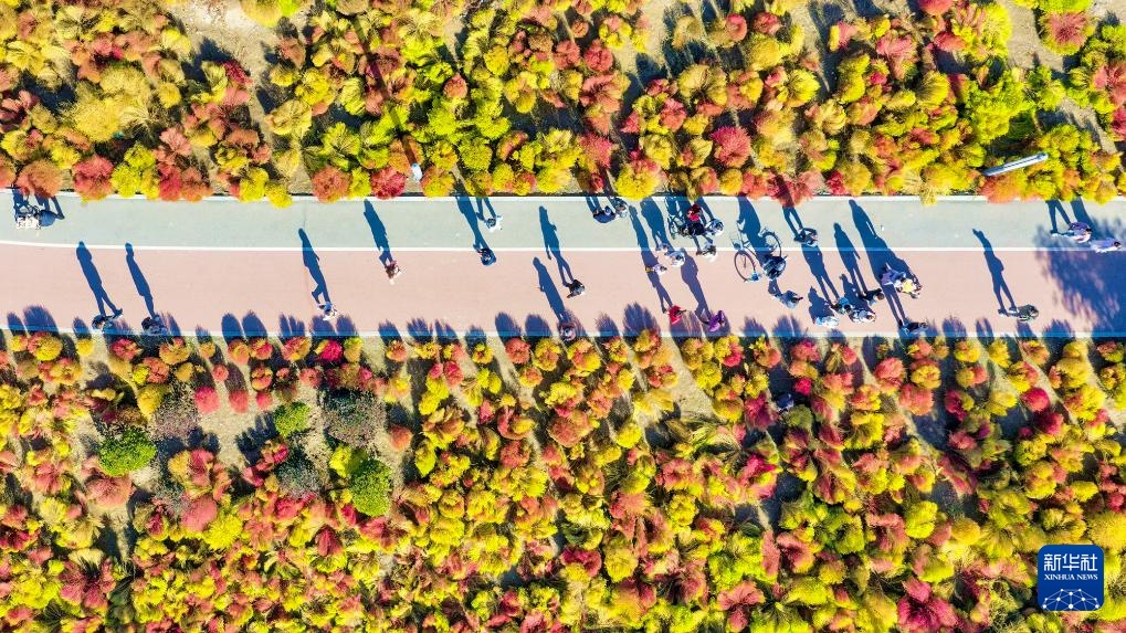 11月2日,游人在天津市濱海新區的白鷺洲公園賞秋游玩(無人機照片)。