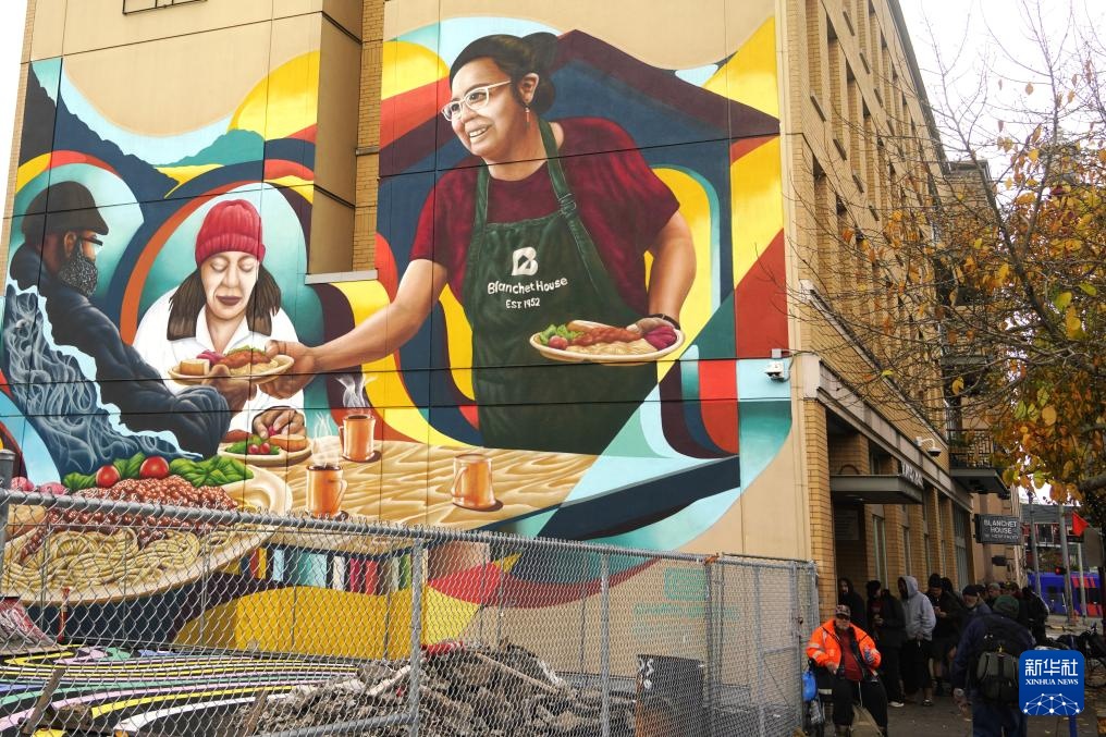 11月4日,在美國俄勒岡州波特蘭,等待領取免費食物的人們在街頭排起長隊。
