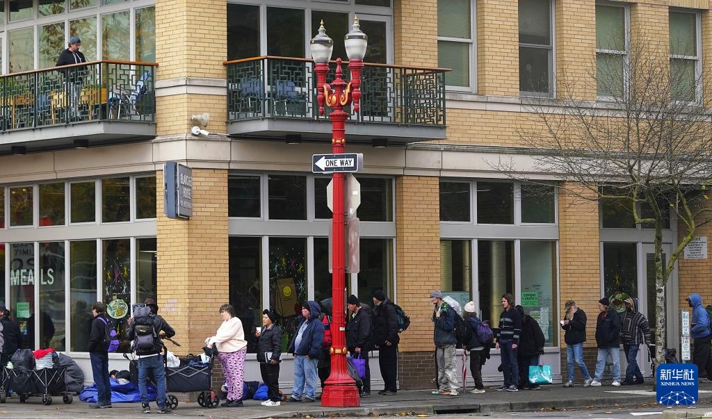 11月4日,在美國俄勒岡州波特蘭,等待領取免費食物的人們排起長隊。