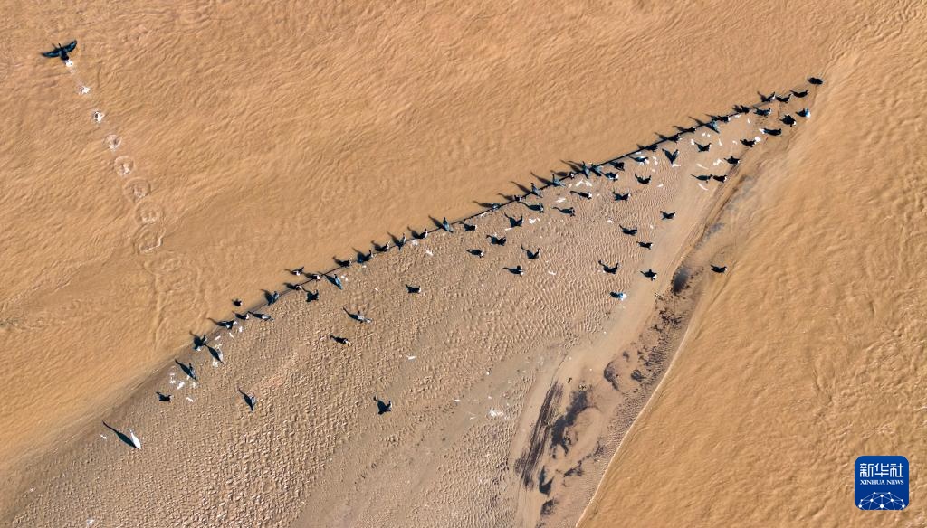 11月4日,在位于寧夏靈武市境內的黃河,候鳥在河灘上駐足棲息(無人機照片)。