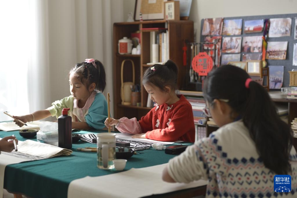 11月2日,孩子們在嘉興平湖市林埭鎮徐家埭村的一家民宿內練習書法。