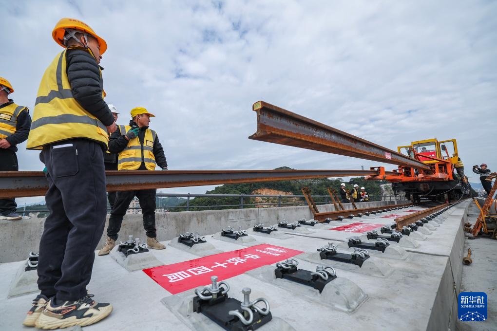 11月5日,在浙江省臺州市杭臺高鐵溫嶺至玉環(huán)段施工作業(yè)現(xiàn)場,中鐵十四局工作人員操作長軌牽引車將首段500米長鋼軌精準(zhǔn)鋪設(shè)在無砟道床上。