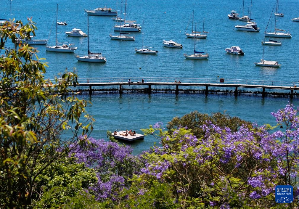 11月5日,在澳大利亞悉尼,人們在藍花楹環繞下的海灘邊休息。