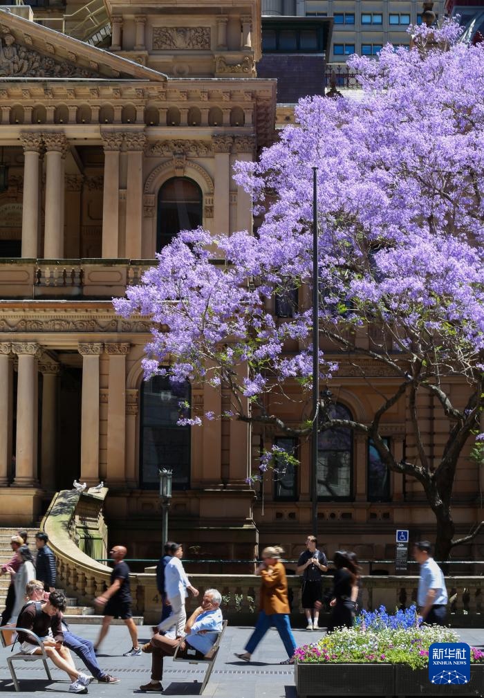 11月5日,在澳大利亞悉尼,人們從市政廳門口的藍花楹樹下走過。