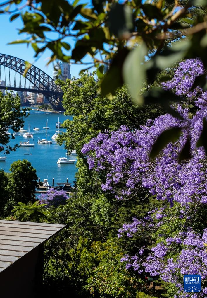 這是11月5日在澳大利亞北悉尼拍攝的盛開的藍花楹和海港大橋。