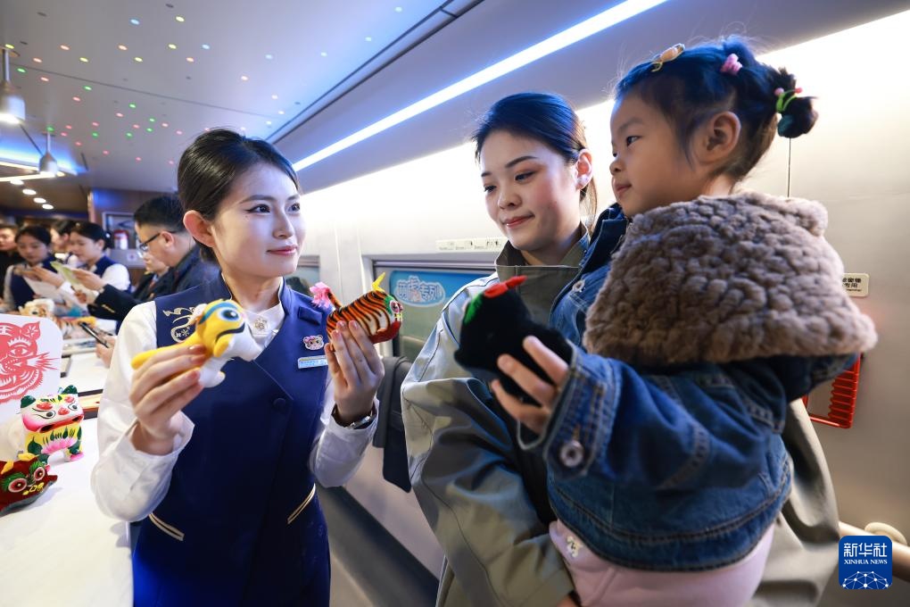 11月5日,G902次“萌虎”主題列車工作人員在餐車為旅客送上布老虎玩具。